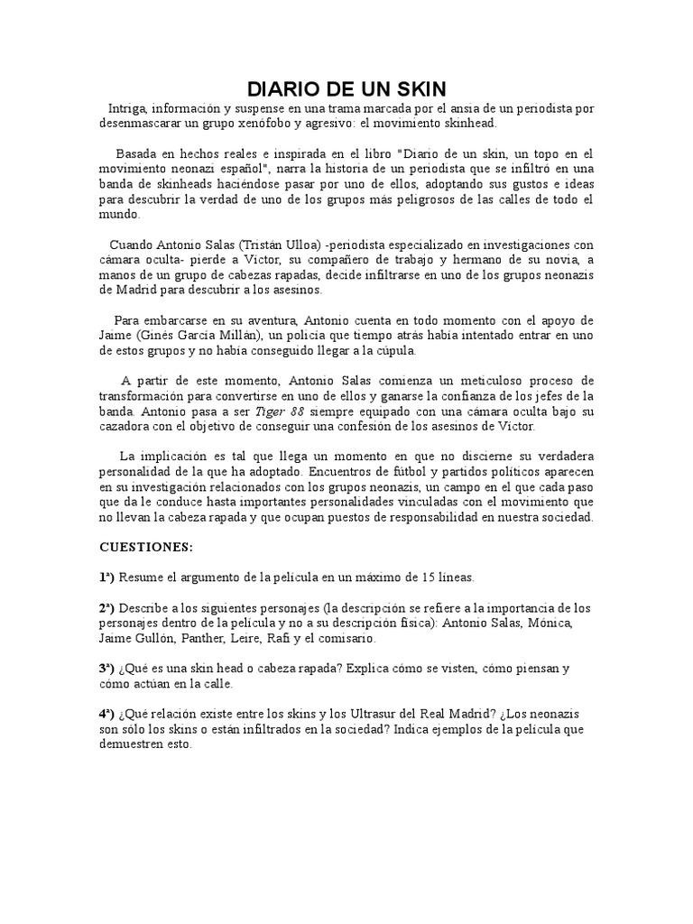 WebPDF | On May 24, 2013, Daniel Lapresa Ajamil published Salas, A. (2003) Diario de un skin. Un topo en el movimiento neonazi español. Madrid: Temas de. WebDIARIO DE UN SKIN descargar en formato audio. Además, si prefieres oÃr el libro en lugar de leerlo, también te damos la opción de conseguir el audiolibro de DIARIO DE UN. WebDiario de un Skin Reporte La pelÃcula se desarrolla alrededor de un método etnográfico, en la cual se puede ver que se desea estudiar a los neonazis o skin, su cultura, sus. WebDiario de un skin es la confesión de aquellos que han logrado por primera vez a infiltrarse de incógnito en un grupo tan peligroso. Con una cámara oculta y tras una.
